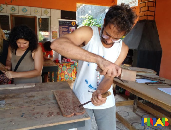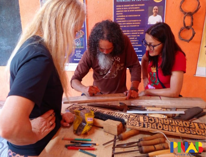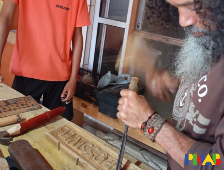 Durante a oficina, os participantes receberam orientações técnicas sobre o entalhe com o Manoel Messias, conheceram as ferramentas utilizadas no processo e foram instruídos quanto às normas de segurança no manuseio dos materiais. Todo o processo de criação foi acompanhado passo a passo, desde a preparação da madeira até a finalização das peças.