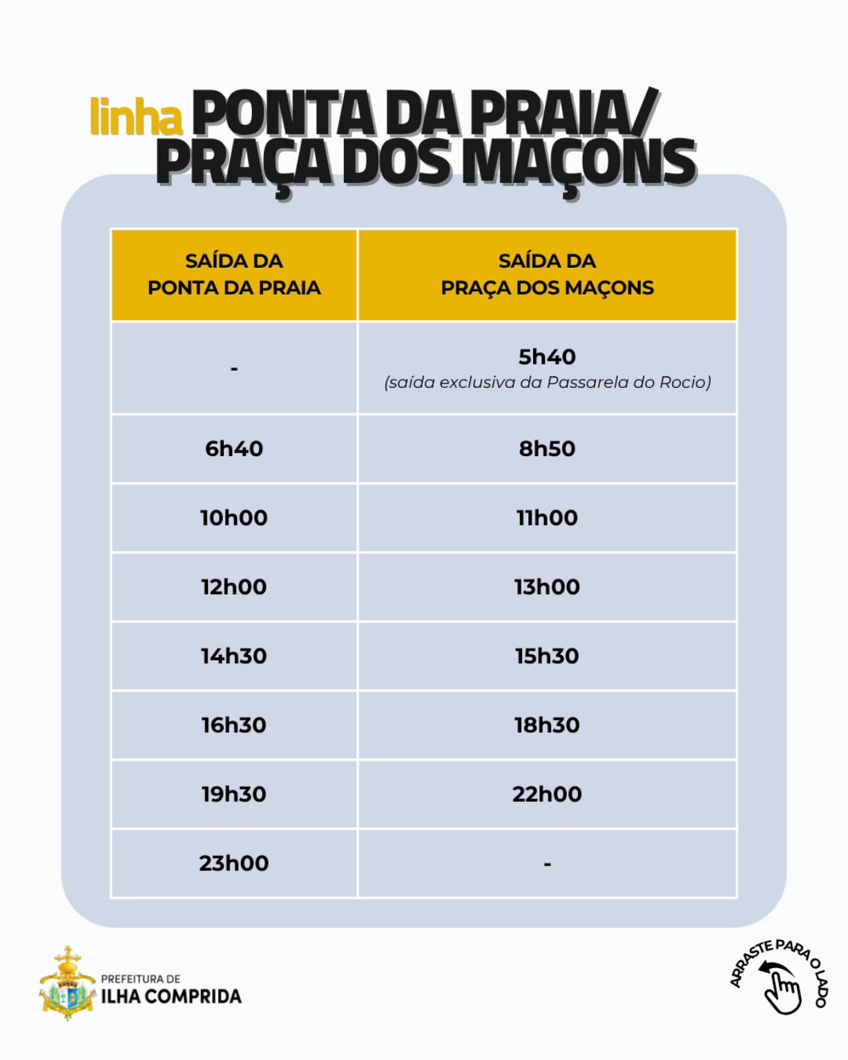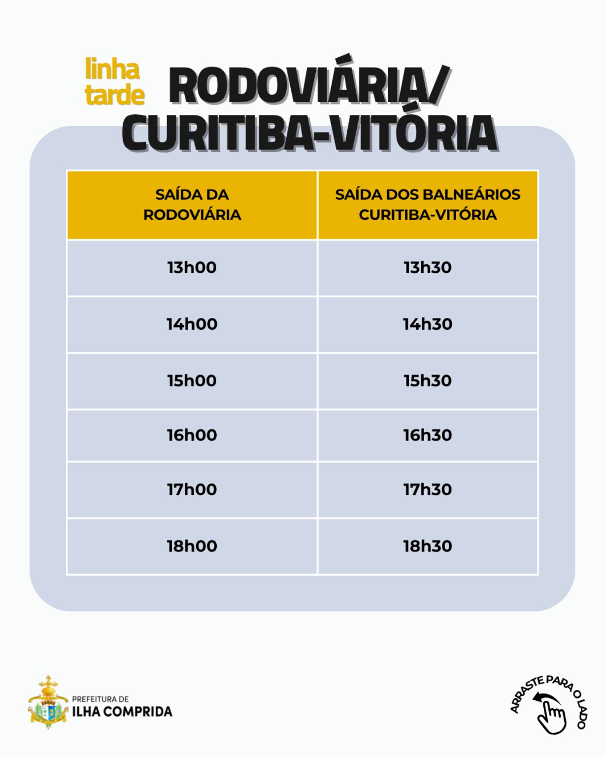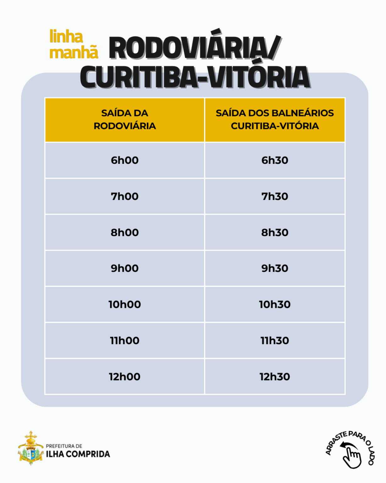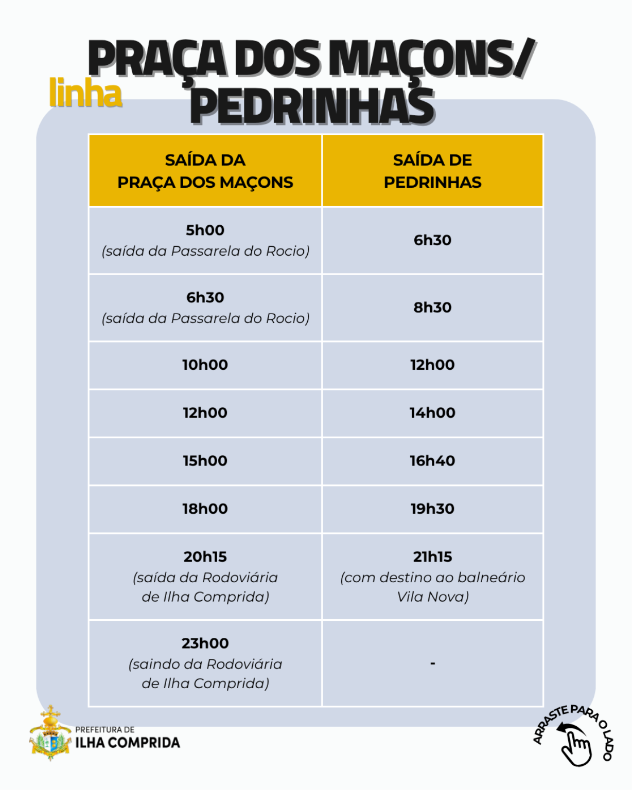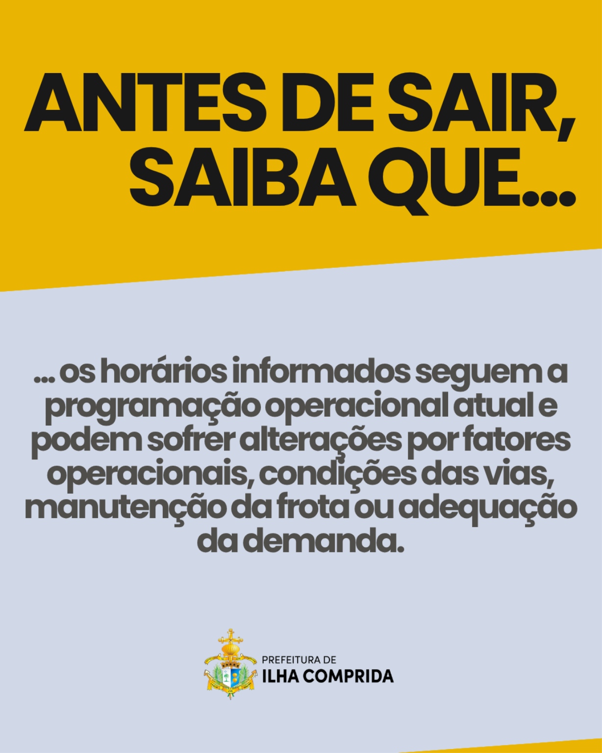 A Prefeitura de Ilha Comprida, por meio da Secretaria Municipal de Serviços Urbanos e Transporte, informa à população a atualização dos horários do transporte público municipal, com o objetivo de facilitar o deslocamento diário dos moradores, ampliar a previsibilidade dos trajetos e contribuir para uma rotina mais organizada em diferentes regiões da cidade.