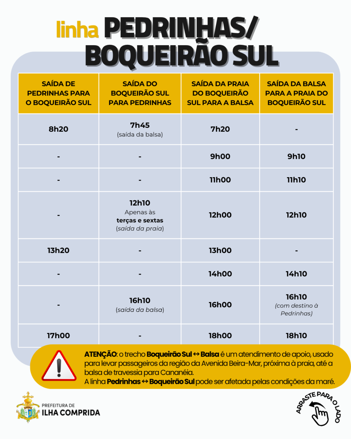 A Prefeitura informa ainda que a linha Pedrinhas ↔ Boqueirão Sul pode sofrer alterações em razão das condições da maré.