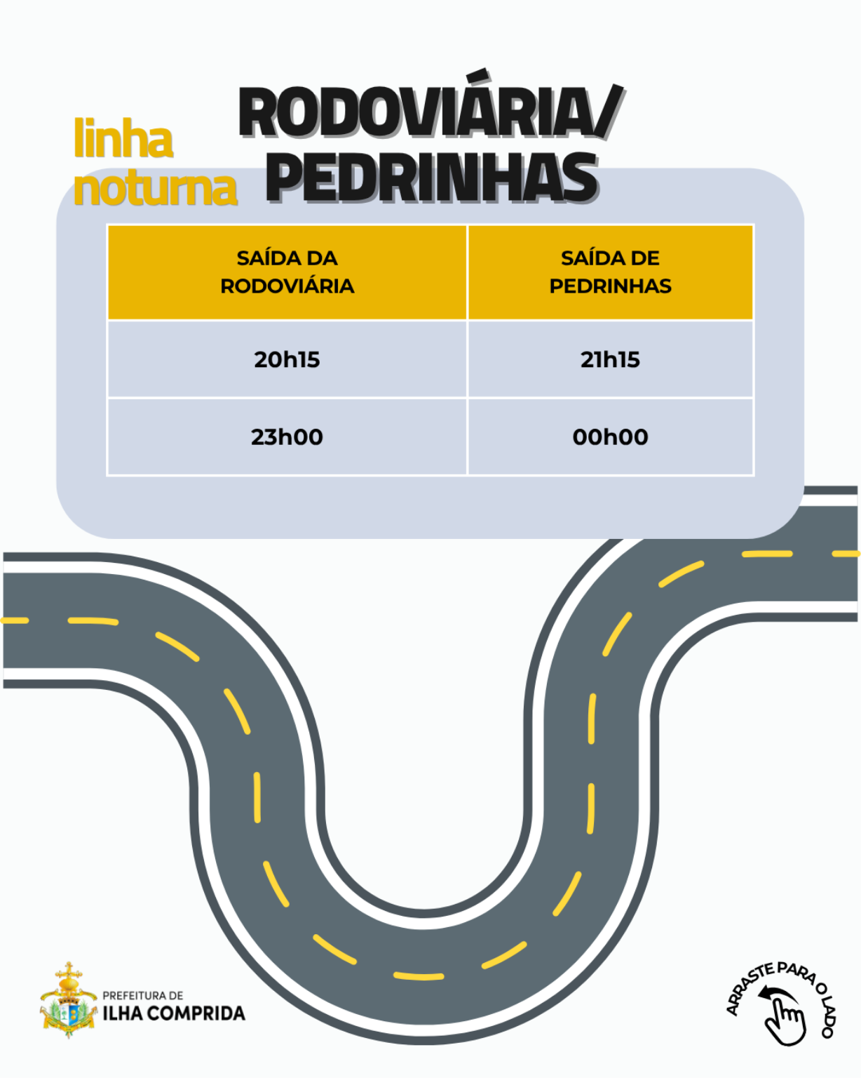 | 20h15 (saída da Rodoviária de Ilha Comprida) | 21h15 (com destino ao balneário Vila Nova) |